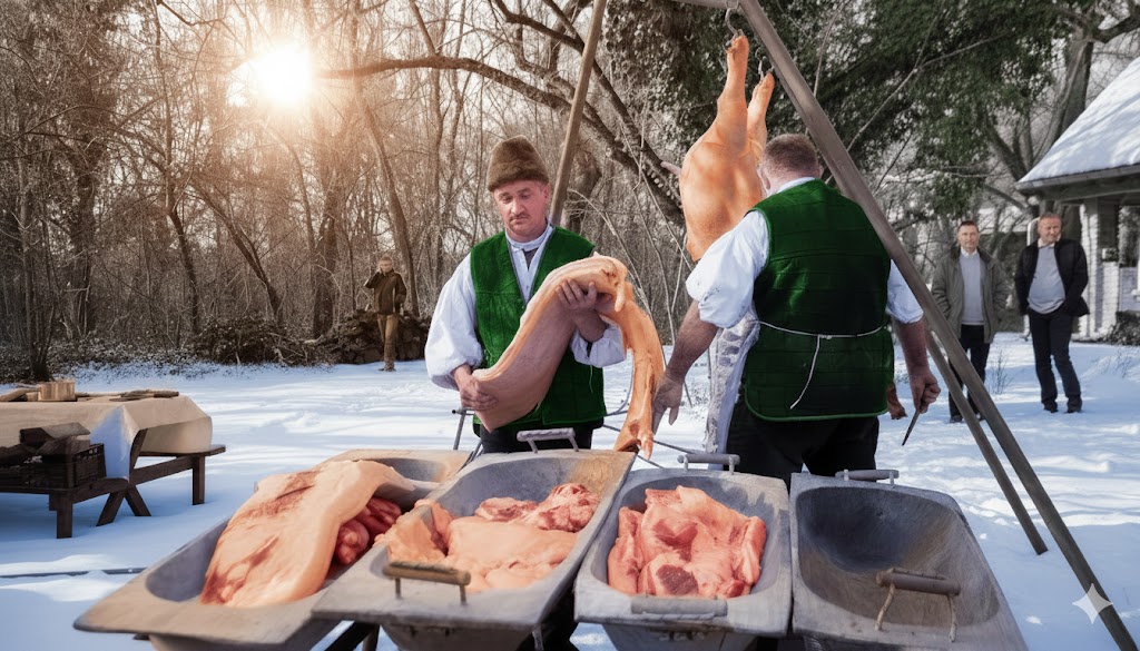 - reggel látványos disznóvágás, hozzá lélekmelegítő pálinka és pogácsa